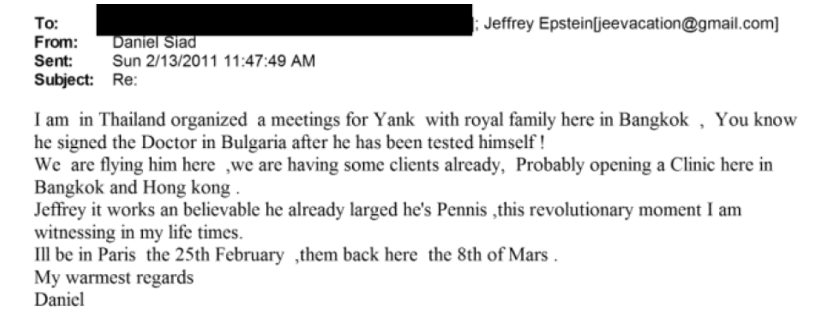 През 2011 г. Сиад и Епстийн обсъждат и лекар, вероятно от България, който е трябвало да бъде отведен в Тайланд за откриване на клиника в Банкок.