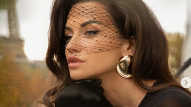 С черна загадъчна воалетка и стил като от филм ноар, Диляна Попова позира пред Айфеловата кула.