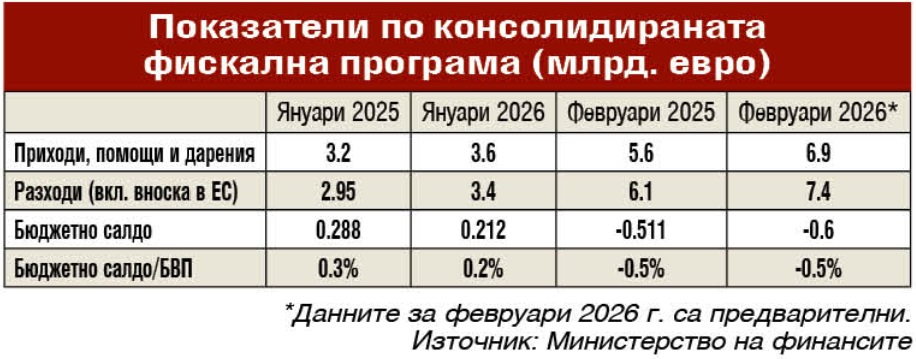 Предварителните данни за изпълнението на консолидираната фискална програма към края на февруари 2026 г. показват, че негативната тенденция от последните няколко години, която дори се задълбочи през 2025 г., продължава. Към края на януари 2026 г. се отчита излишък от 212.1 млн. евро, което представлява 0.2% от прогнозния брутен вътрешен продукт. Този положителен резултат обаче прикрива мащабно превишаване на разходните лимити. Приходите и помощите за януари възлизат на приблизително 3.6 млрд. евро, докато разходите достигат 3.4 млрд. евро.