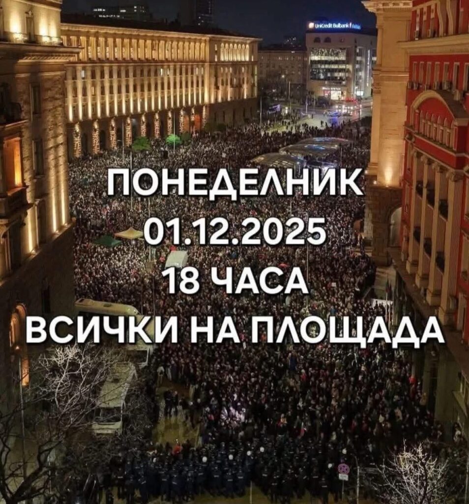 В понеделник е обявен огромен граждански протест пред Партийния дом – Бастион на Пеевски и Борисов, които са барикадирани в кабинетите на диктатора Тодор Живков и Милко Балев. Борисов и Пеевски се опитаха да подменят целите и съдържанието на протеста, но в понеделник се очакват над 50 хиляди граждани, които ще им искат оставките, а не само пълното изтегляне на бюджета.