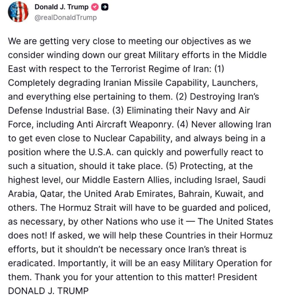 Ормузкият проток ще бъде охраняван и патрулиран, когато е необходимо, от други страни, които го използват – Съединените щати не го правят! Ако бъдем помолени, ще помогнем на тези страни в усилията им да осигурят пролива, но това няма да е необходимо, след като иранската заплаха бъде елиминирана. Важно е да се отбележи, че това ще бъде лесна военна операция за тях.“