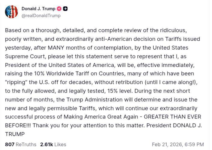 „Въз основа на задълбочен, подробен и пълен преглед на нелепото, лошо написано и изключително антиамериканско решение за тарифите, издадено вчера, след МНОГО месеци обмисляне, от Върховния съд на Съединените щати, моля, нека това изявление служи като представяне, че аз, като президент на Съединените американски щати, ще повиша, с незабавно действие, 10% световната тарифа за страни… до напълно разрешеното и законно тествано ниво от 15%“, написа Тръмп в Truth Social.