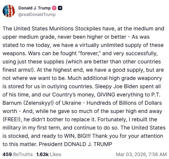 „Запасите от боеприпаси на Съединените щати на средно и високо ниво никога не са били по-големи или по-добри. Както ми казаха днес, ние разполагаме с практически неограничени запаси от тези оръжия. Войните могат да се водят „вечно“ и много успешно, използвайки само тези запаси (които са по-добри от най-добрите оръжия на други страни!). На високо ниво имаме добри запаси, но все още не сме достигнали нивото, което желаем. Много допълнителни висококачествени оръжия се съхраняват за нас в други страни. Сънливият Джо Байдън е прекарал цялото си време и парите на страната ни, отказвайки всичко на П. Т. Барнъм (Зеленски!) от Украйна – стотици милиарди долари. И докато е раздал толкова много свръхмодерни оръжия (БЕЗПЛАТНО!), той дори не е помислил да ги замени. За щастие, аз възстанових армията си през първия си мандат и продължавам да го правя. Съединените щати са готови да спечелят и готови да спечелят с големи успехи! Благодаря ви за вниманието към този въпрос.“