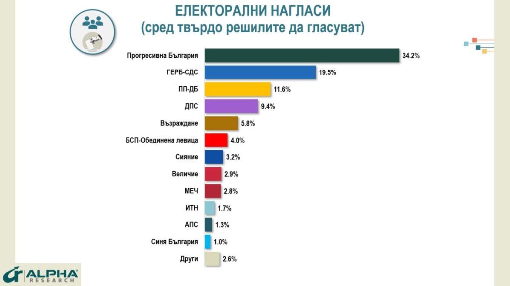 „Най-висока електорална подкрепа получава Прогресивна България – 34.2% от сигурните, че ще гласуват в неделя. Преднината ѝ от 10 процентни пункта в началото на кампанията се увеличава до почти 15 пункта. Втори остават ГЕРБ-СДС с 19.5%. Те запазват твърдото си ядро от избиратели, но при по-високата избирателна активност намаляват относителната си тежест. Трета позиция заемат ПП-ДБ с 11.6%. Проучването не регистрира връщане към най-високите им нива на подкрепа, отбелязани веднага след декемврийските протести, но при добра мобилизация в последните дни, могат да запазят третото място. 9.4% е заявената подкрепа към ДПС. При тази партия и на предишни избори са наблюдавани значими колебания и силни вариации от избори на избори в отделните населени места. Поради това не са изключени по-съществени амплитуди и в двете посоки. „Възраждане“ се очертава като петата почти сигурна партия в 52-ия Парламент с подкрепа от 5.8%. БСП показа способност за мобилизация в хода на кампанията и финишира на ръба на парламентарното представителство с 4%“, посочват от „Алфа Рисърч“.