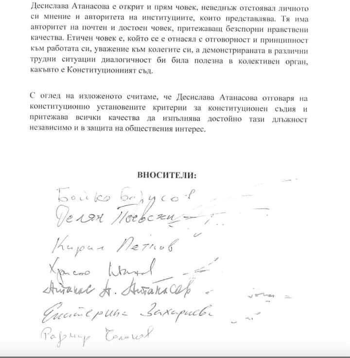 Кирил Петков, Христо Иванов и Атанас Атанасов (тримата от ПП-ДБ) са подписали заедно с Бойко Борисов, Делян Пеевски и други типове предложение, според което Деса Атанасова от ГЕРБ-Дулово, е „почтен и достоен човек, притежаващ безспорни нравствени качества“ и „би била полезна“ да работи в Конституционния съд.