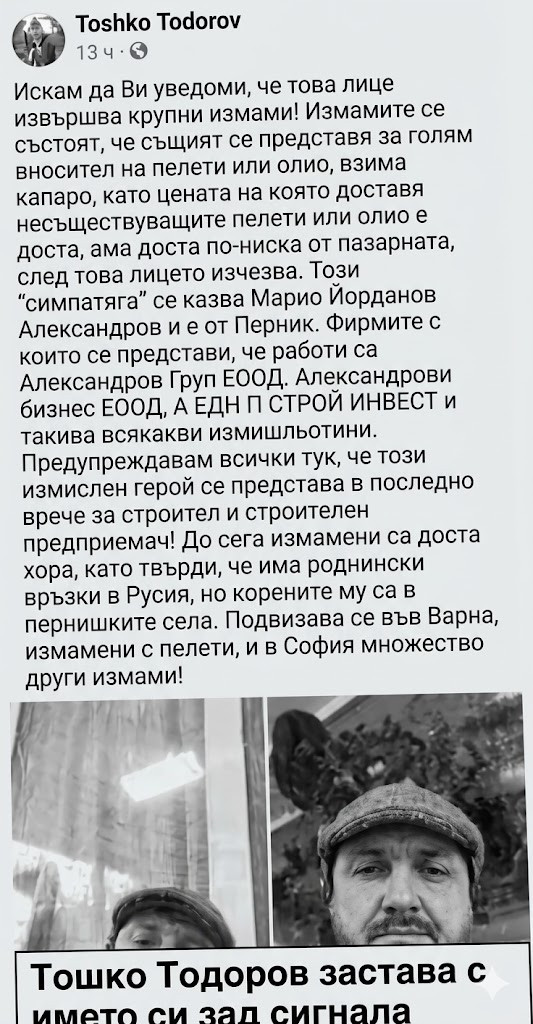 Нов грандиозен измамник, маскиран като мастит бизнесмен, сее паника и завлича десетки наивници в цяла България. Става дума за Марио Йорданов Александров от Перник, който според запознати всъщност преживява като обикновен шофьор в мароканското посолство в София. Жертви на схемите му, сред които и Тошко Тодоров, алармират за „крупни измами“, разигравани в София, Варна и други градове.