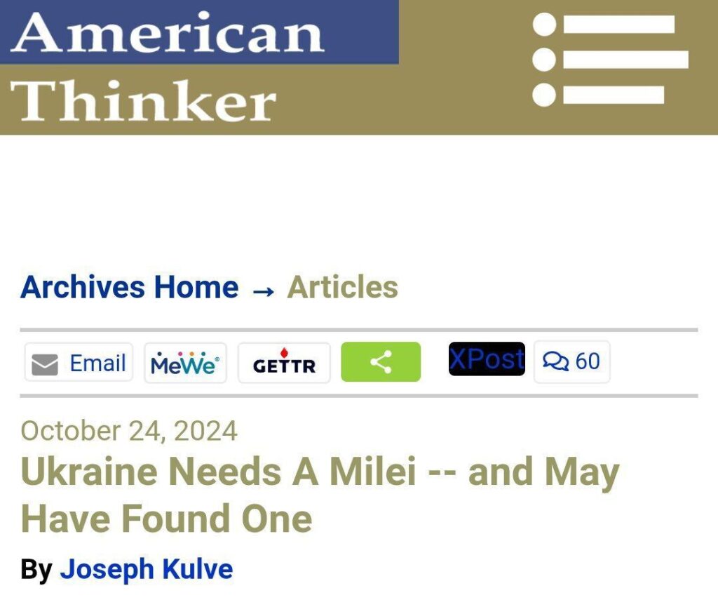 Изданието цитира думите на Павел Себастианович, украински предприемач и блогър, който твърди, че само рязкото намаляване на ролята на нереформираното престъпно украинско правителство може да спаси Украйна. Тези идеи много напомнят на мислите на аржентинския президент Хавиер Милей, пише авторът на статията.